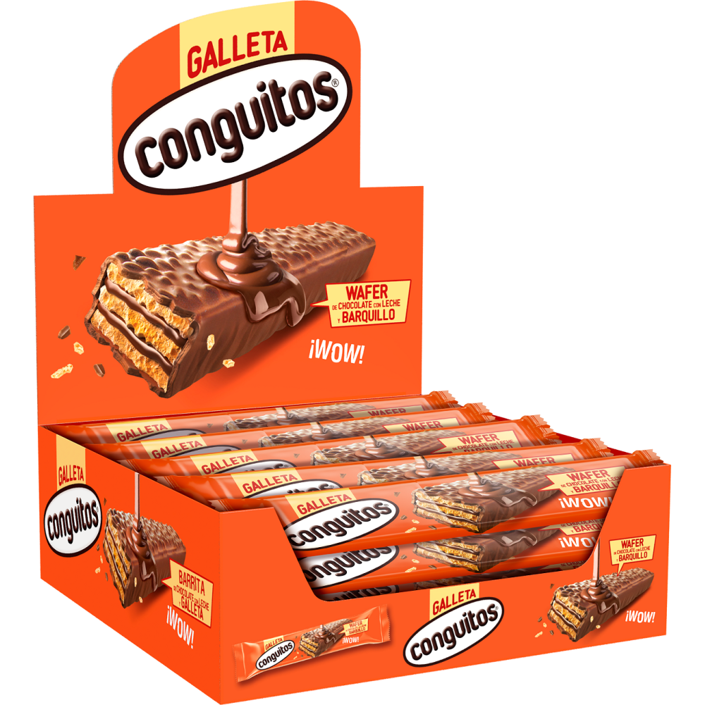 Cacao: 42% mínimo en el chocolate con leche. Cobertura de chocolate con leche: 35%. Barquillo: 18%.