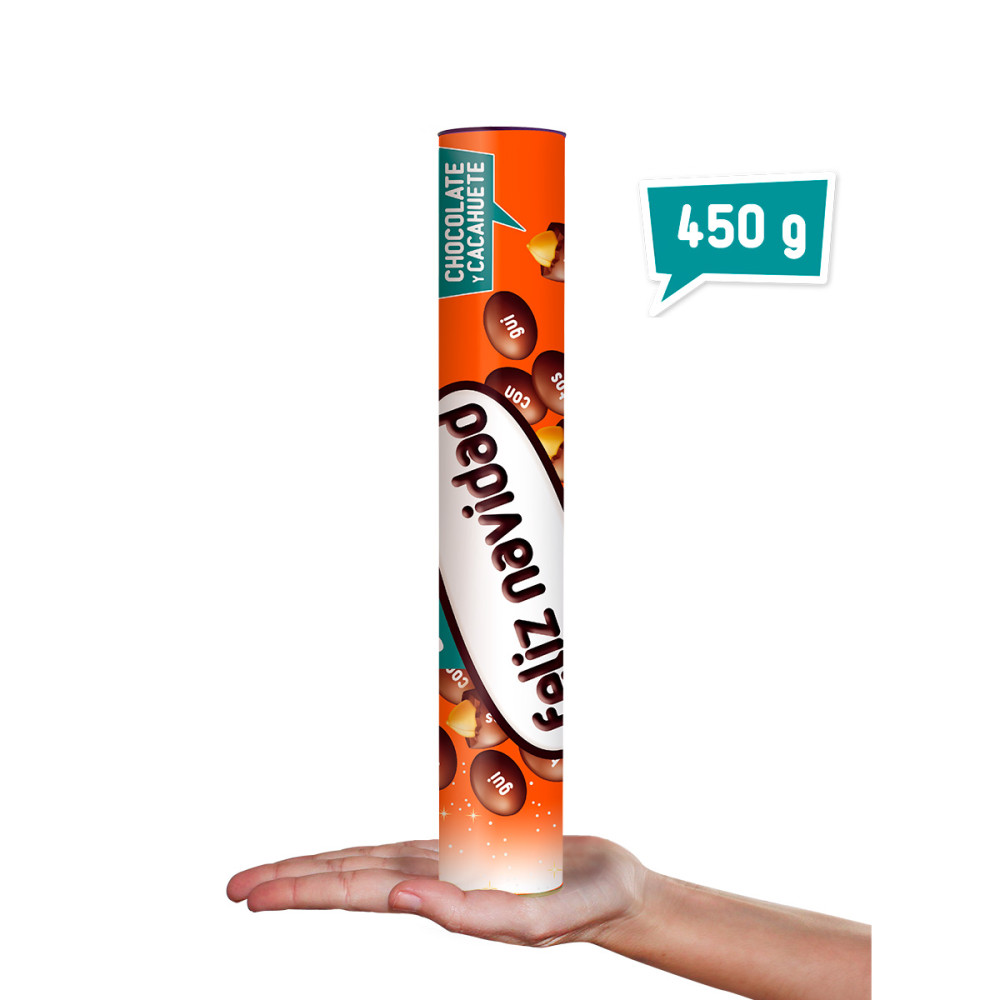 Cacahuetes tostados recubiertos de chocolate en formato TUBO Feliz Navidad.