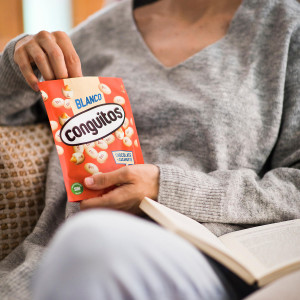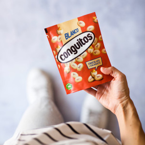 Cacahuetes tostados recubiertos de chocolate blanco. ¡Riquísimo!
