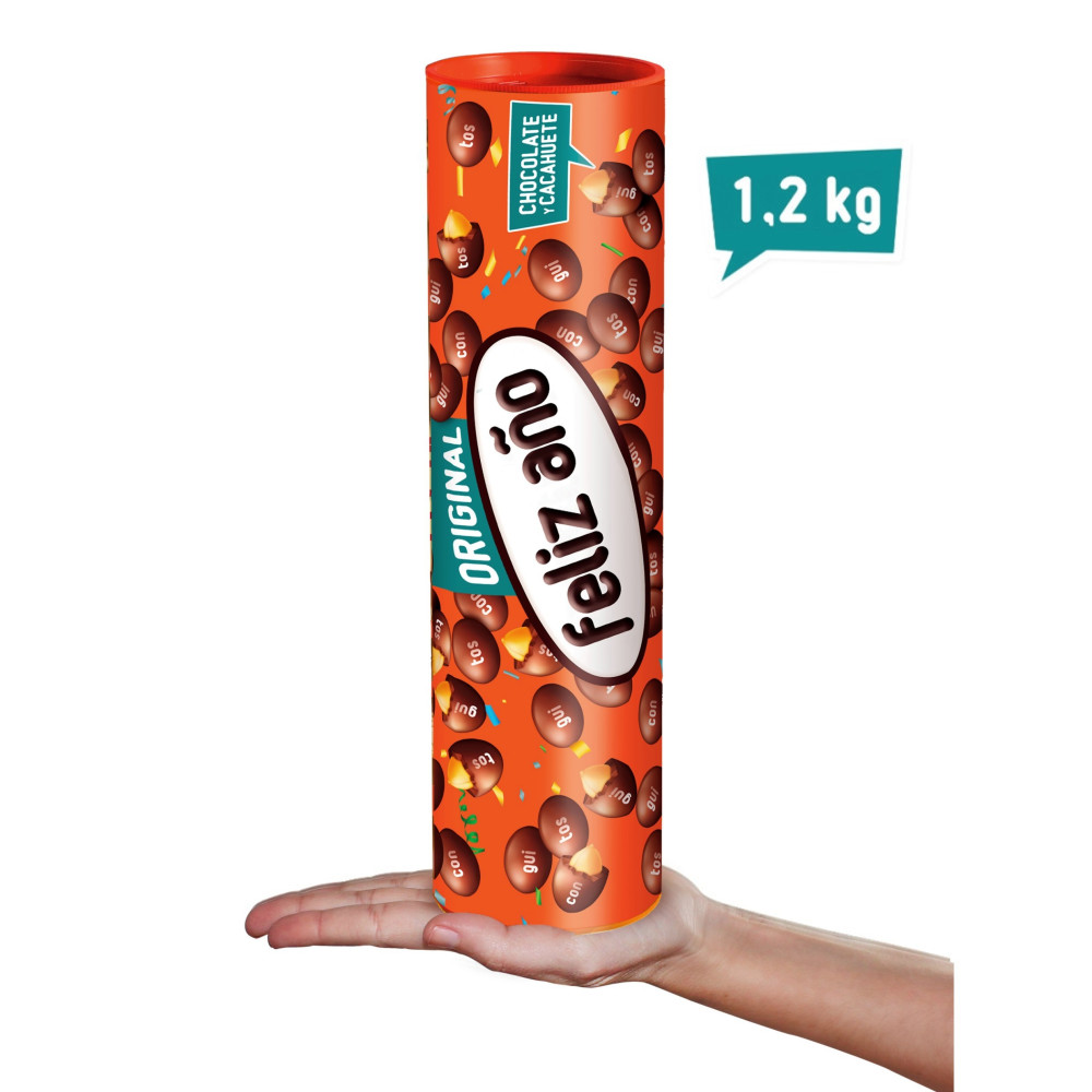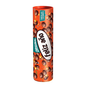 Cacahuetes tostados recubiertos de chocolate negro. Ahora en formato MEGATUBO Feliz Año. Es el regalo perfecto para desearle un próspero Año Nuevo a tus amigos y seres queridos.