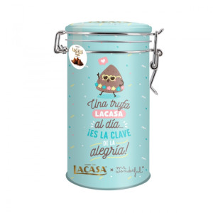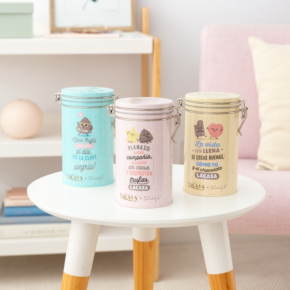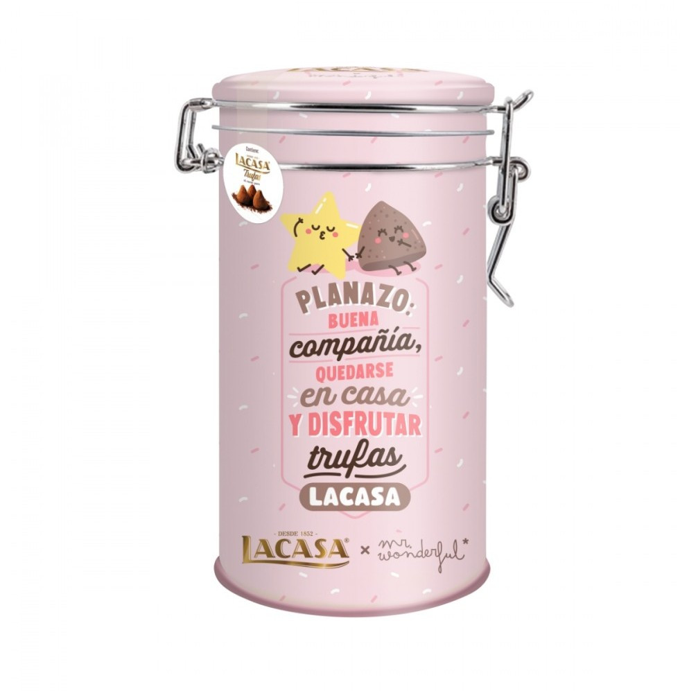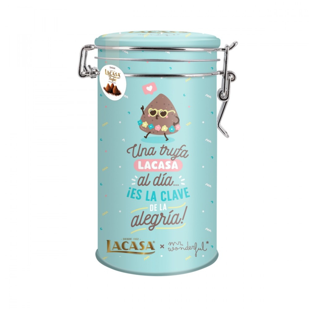 Alegres latas de Lacasa & Mr Wonderful con deliciosas trufas Lacasa al cacao puro en su interior (bolsitas de 100 g).
