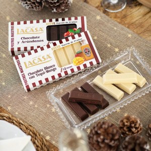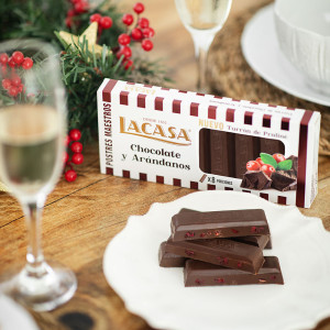 Turrón de Chocolate y Arándanos: sutil mezcla entre el intenso y dulce sabor del chocolate negro y la acidez de los arándanos rojos. Una elección ganadora si eres amante de estos frutos de moda.