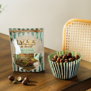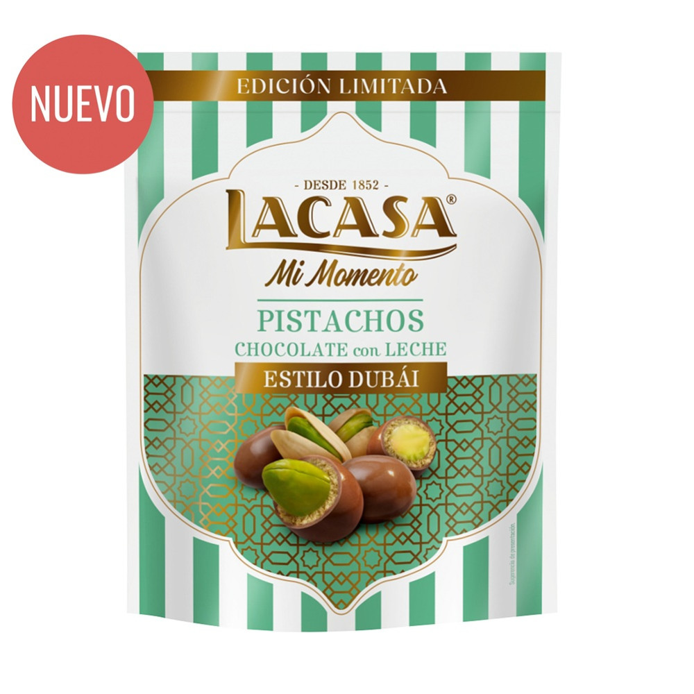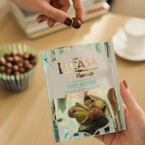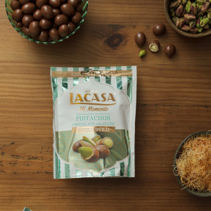 Novedosos pistachos recubiertos de doble capa. En el interior, el habitual pistacho entero tostado de Mi Momento Lacasa, sin embargo, en esta Edición limitada, va cubierto por una crujiente crema de pistacho y kataifi y de chocolate con leche.