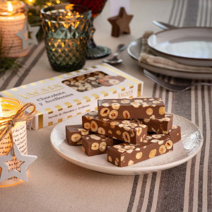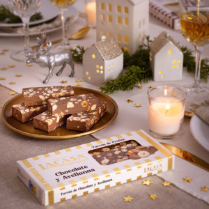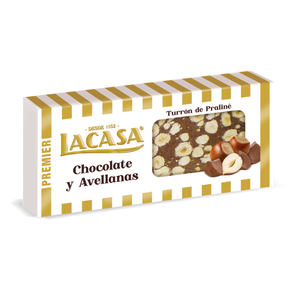 Turrón de Chocolate con Avellanas Lacasa: Delicioso turrón de chocolate con leche y avellanas enteras tostadas.