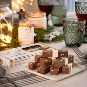 Elaborado con tres capas de fundente praliné de chocolate: chocolate con leche, blanco y negro. Un placer irresistible para los paladares más chocolateros.