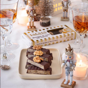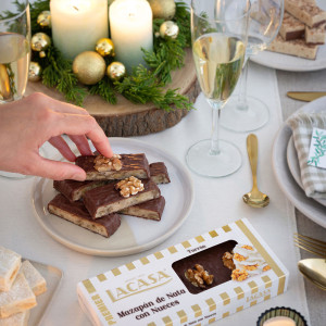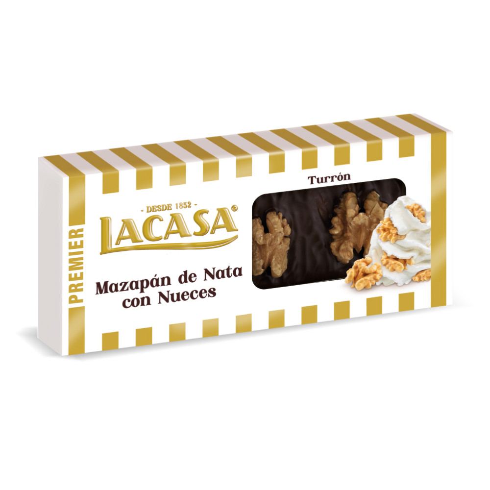 Tradicional mazapán de nata con trocitos de nuez en su interior y decorado con nueces de California.