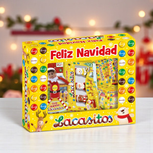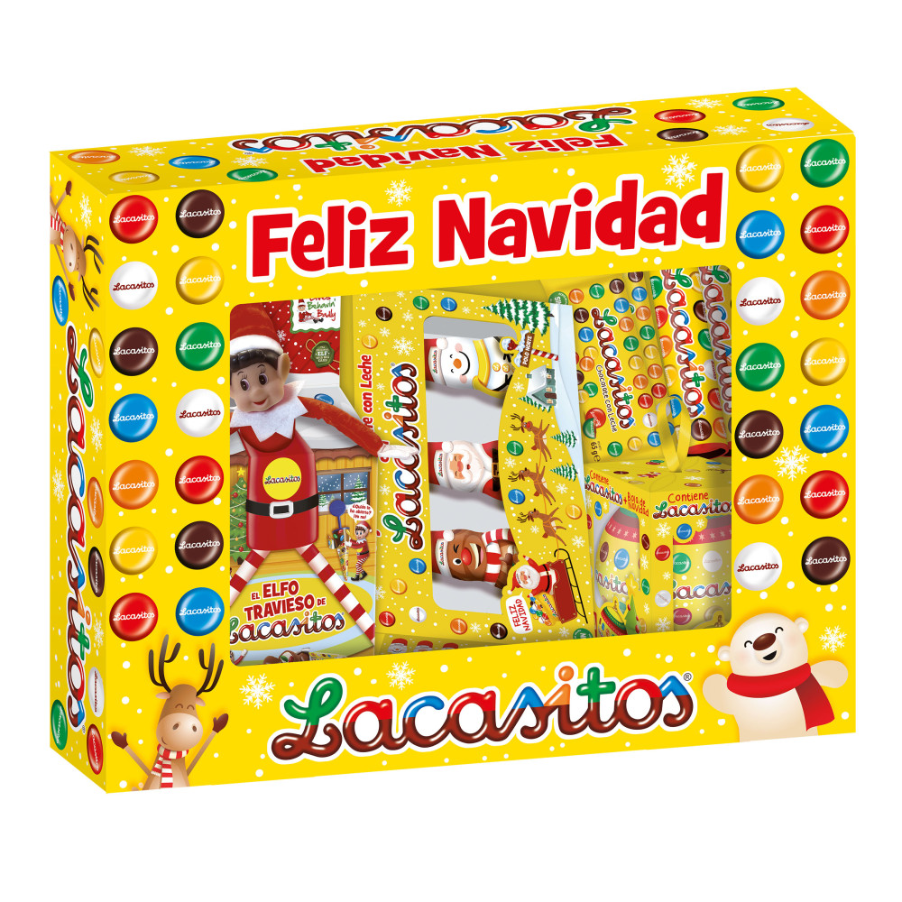 Esta colorida caja de regalo está pensada para llenar de ilusión cada rincón del hogar. En su interior encontrarás al Elfo Travieso Lacasitos, un simpático personaje navideño listo para acompañar tus fiestas, junto con un surtido de chocolates Lacasitos en diferentes formatos.