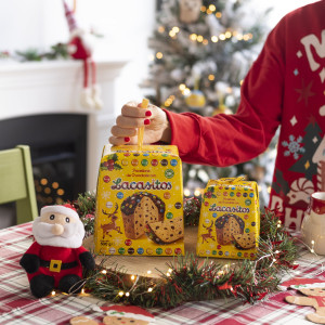 Panettone con trocitos de chocolate y cubierto de Chocolate con leche y Lacasitos.