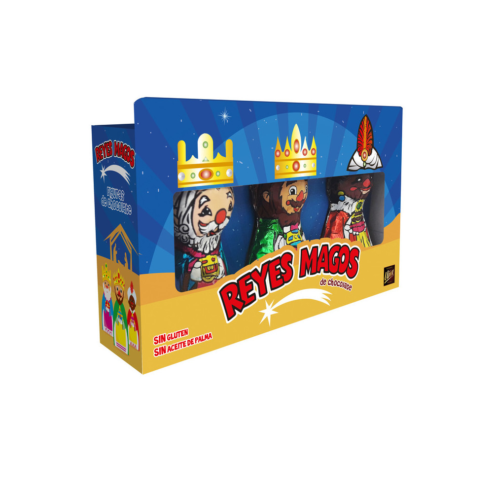 Cajita con las tres figuras de los tres reyes magos hechas de chocolate con leche y huecos por dentro.