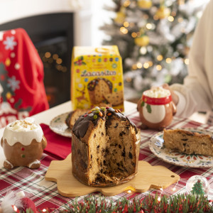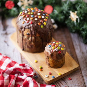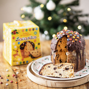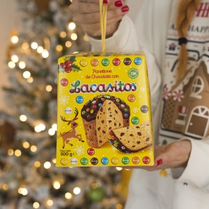 Tierno y esponjoso panettone con pepitas de chocolate en su interior, recubierto de fundente chocolate y deliciosos Lacasitos.
