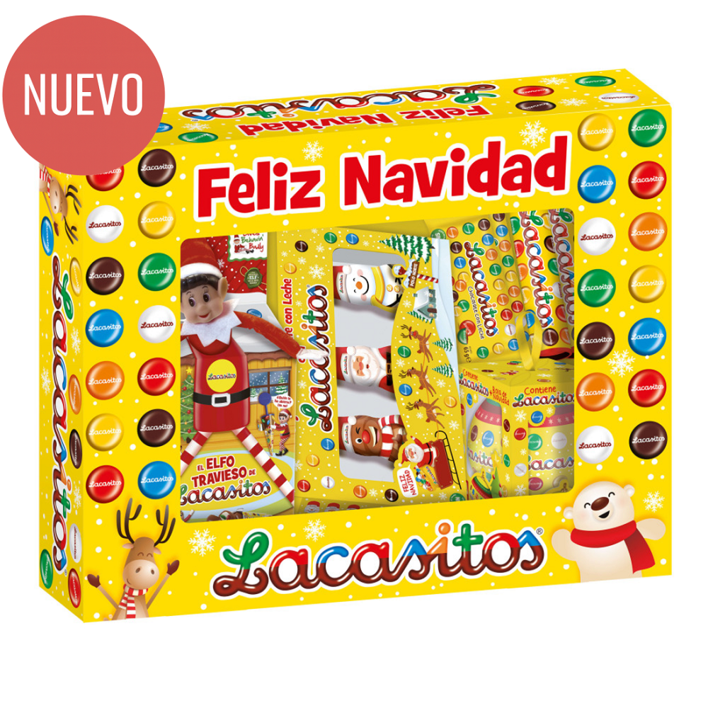 Esta colorida caja de regalo está pensada para llenar de ilusión cada rincón del hogar. En su interior encontrarás al Elfo Travieso Lacasitos, un simpático personaje navideño listo para acompañar tus fiestas, junto con un surtido de chocolates Lacasitos en diferentes formatos.